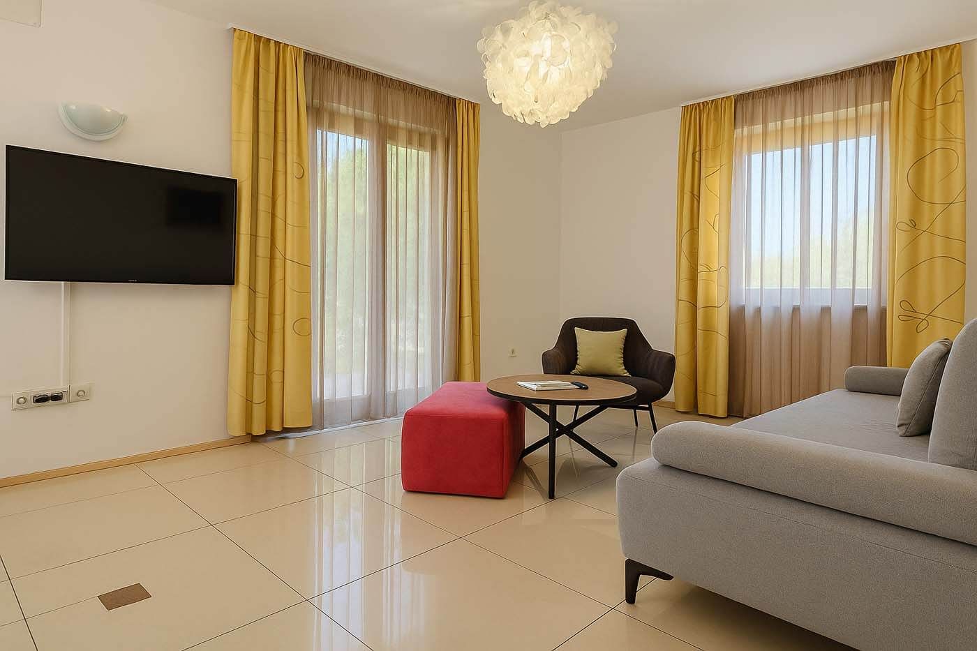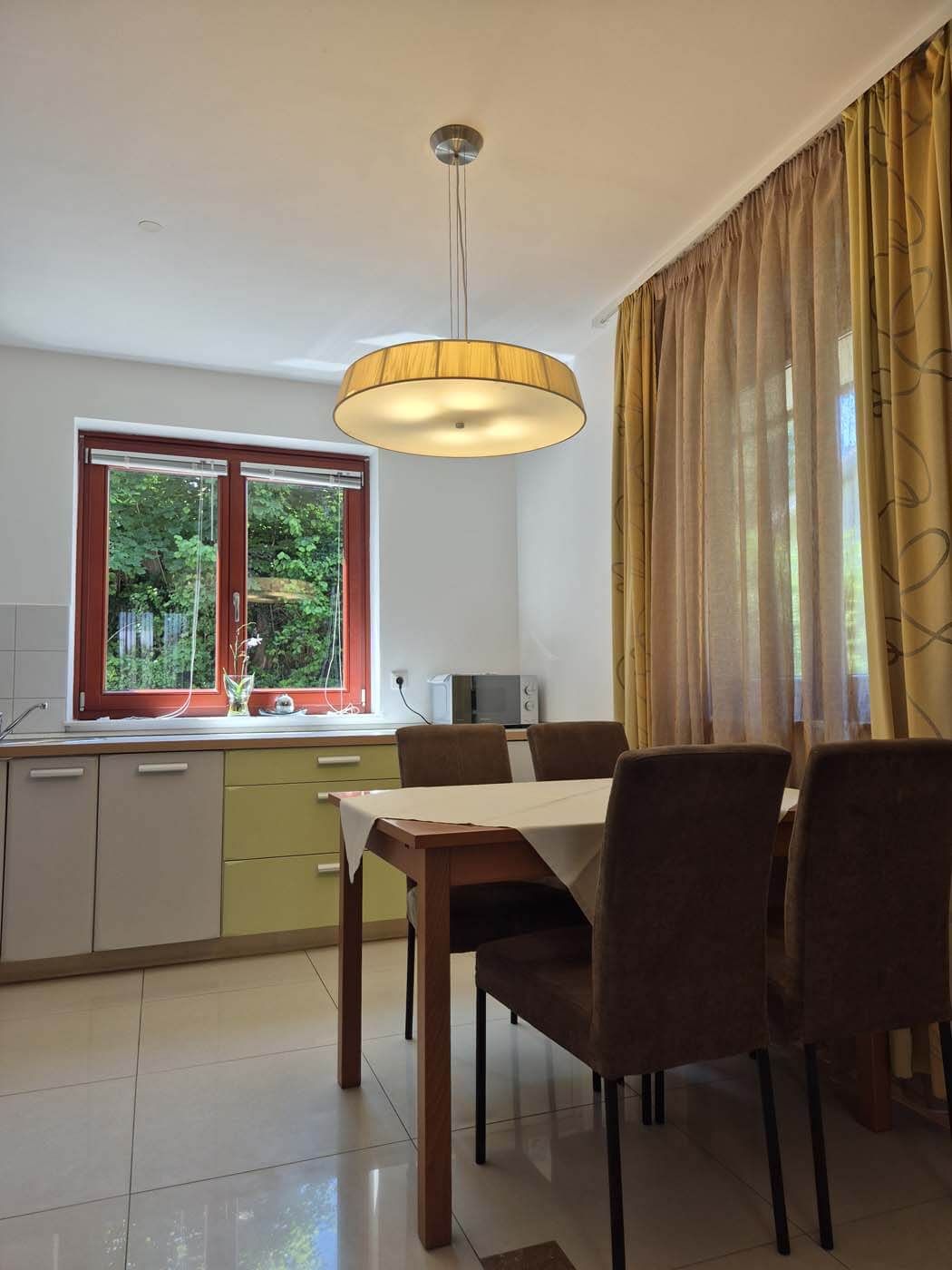 This apartment offers a peaceful retreat with a beautiful terrace and stunning mountain views. It includes a bedroom with a double bed (180x200) and a bathroom with a shower. The kitchen is fully equipped, and there is also a spacious living room with two sofas, one of which is a double bed. The second sofa offers comfortable seating in front of the TV. The apartment also has a dining area.